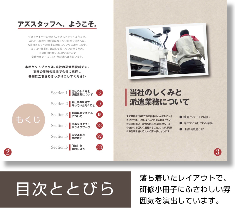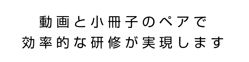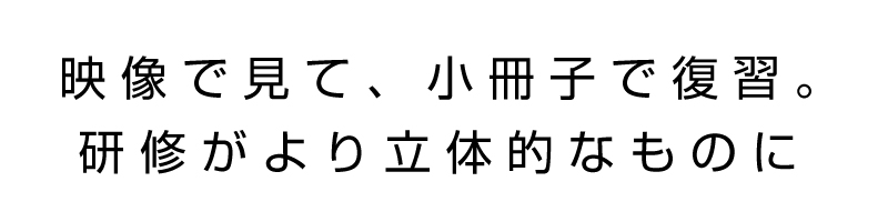 動画のメリットと、印刷物のメリット。その両方を活かせるのが、「研修用ポケットブック」。同時制作なら撮影を共用できる。これは見逃せないメリットで、予算管理の上で断然おトク。さらに制作進行のやりとりも一元化できるため、無駄のないプロセスを実現できます。動画と小冊子、合わせての制作がおススメです。