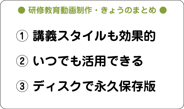 このように、研修用の動画を撮影収録し、DVDにまとめておくとさまざまな活用方法があり、その後の展開幅をさらに広げることができます。