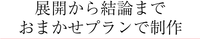 実際はあまりない制作手法なのですが、世の中の映像需要は文字通りさまざま。「~~に関する動画を作って。内容はまかせる!」といったお客さまも実はそれなりにいらっしゃいます。そうした需要にバッチリお応えするのがこのプラン、というわけです。