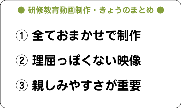 思えば、素材もない、元ねたもない、ストーリーもない、それどころか落としどころすらない。そんな状態で、研修用動画を作りなさい、というわけですから。常識的に言えば「できません」というのが、常識的な制作者であることでしょう(笑)。