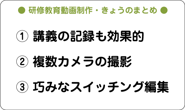 以上のように、記録動画といえども「押さえるべきポイント」が明確に存在するのが、研修用動画。とりわけ「マルチカメラ」は必須であり、欠かせない要素といえます。
