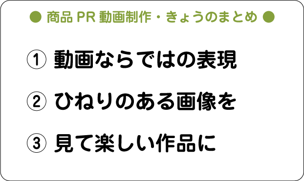 上記のようにさまざまなカットを多彩に撮影しましたが、ただただ漠然と撮ったわけではありません。全てのカットに「何かしらの」ひとひねりが加えられています。本制作は、この「撮影上のひとひねり」がよい感じで効いた内容となっています。