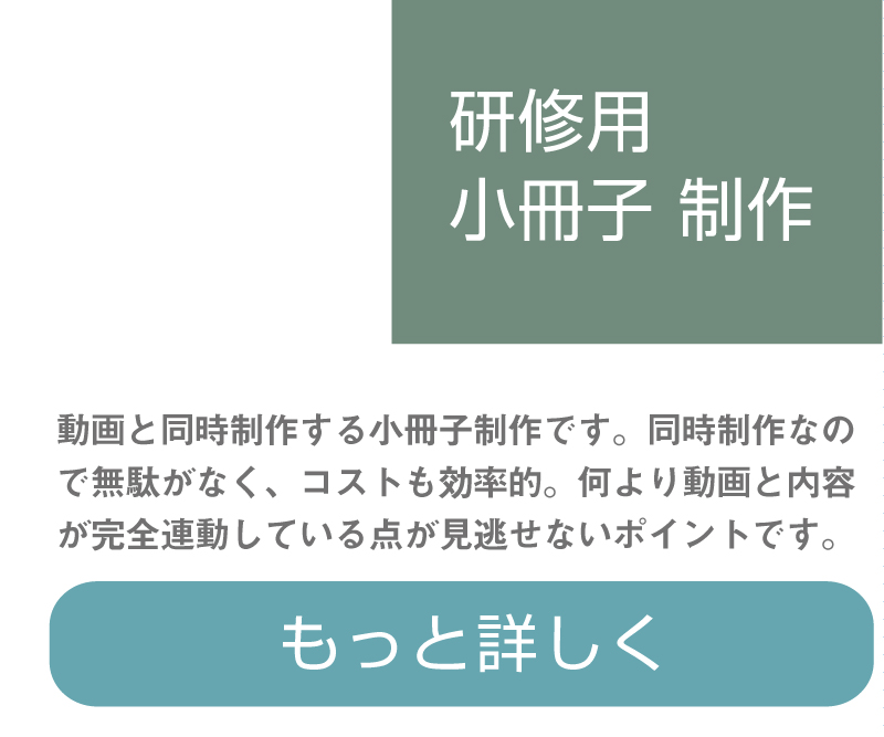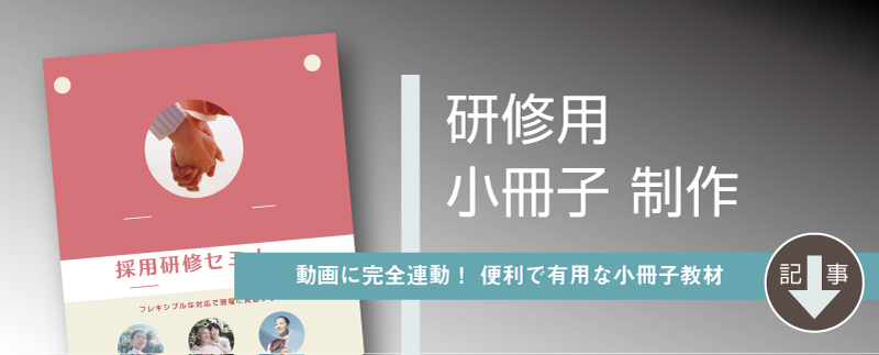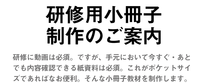 コンサル会社の教材制作・(2) 小冊子教材制作 2020/04/12 研修動画にプラス! 小冊子ポケットブックが、研修をさらに効果的なものに。小さい、軽い、分かりやすい! 何かと便利な「ポケットブック教材」動画と並行制作で手間・無駄も半減。おトクな小冊子教材の制作サービス動画で学び、ポケットブックで復習。クレド的な活用も可能な小冊子教材小さい、分かりやすい! 研修教材ポケットブックの作例サンプルページ小冊子教材に連動。音も動きもある研修動画で基礎部分をしっかり学習招待講演やゲスト講演など。貴重な実施セミナーは動画で永久保存。資料を取り寄せて、しっかり検討。研修動画・小冊子のご紹介資料です。おかげさまで創業20年。研修動画制作・教材制作は弊社にご相談ください。まんがで弊社をご紹介しています。弊社のなりたち・あゆみを少しだけご紹介しています。まずはご相談ください。ご希望の方にはご検討資料をご郵送いたします。さいたま・所沢・西東京・多摩地区を拠点に全国対応いたします。