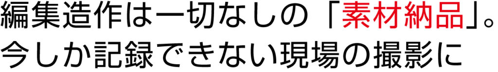 会社・職場で必要な「動画の撮影」をいたします。凝った編集は一切なしの「素材納品」。素材とはいえ、プロによる撮影なので編集なしで活用が可能。凝る必要は特段なく、ちょっと動画が必要、だけどプロによるまっとうな品質が欲しい…そんなとき、便利にご活用いただけるサービスです。