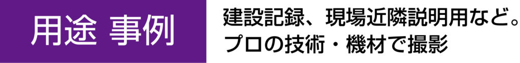 建設状況、施工プロセスの写真撮影は現場で必須。最近はデジタルカメラ、スマートホンの普及により、誰でも手軽に撮影が行えるようになりました。今後は動画も同じくらいポピュラーな存在になることでしょう。ただし。動画は思った以上に「うまく撮る」のが難しい…そう感じている現場ご担当者さまも多いのではないでしょうか。そんなときこそ、本サービスをご利用ください。プロの技術・機材で、必要な動画を撮影します。特段の編集を行わない素材撮影。映像は、説明用や記録用など。多彩にご活用いただけます。