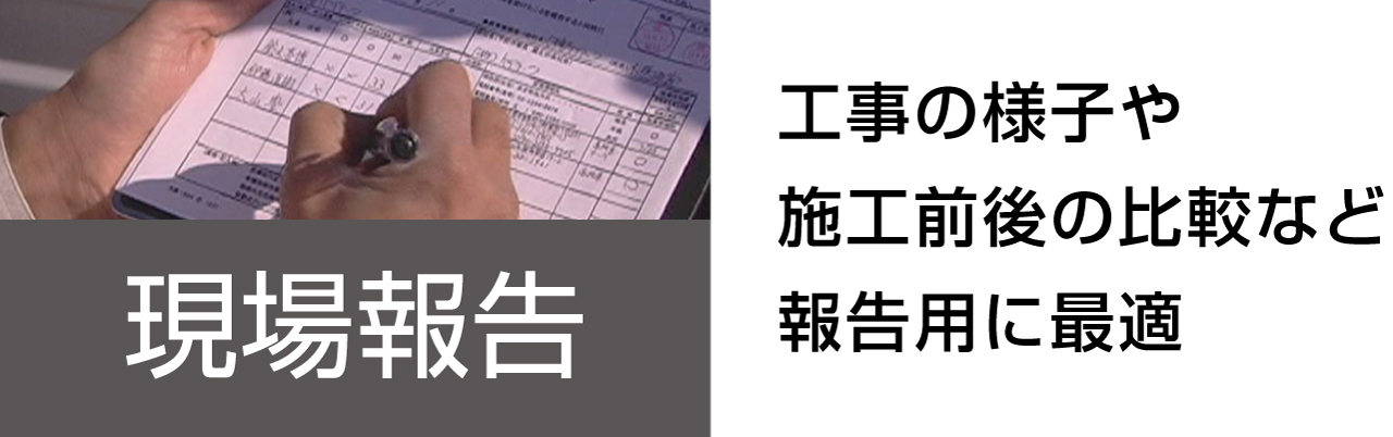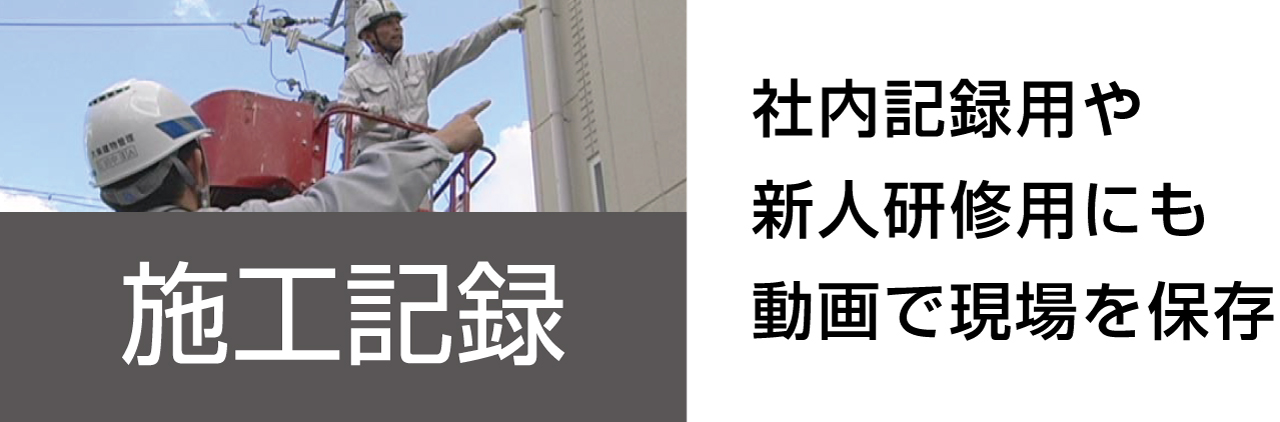 工事の様子や「施工前」「施工後」を、動画で残します。これまでは写真で行わることが多かった、この種の記録。動画だと、よりリアルに再現することが可能になります。同じ映像でも、写真とはまったく異なる効果を実感していただけます。