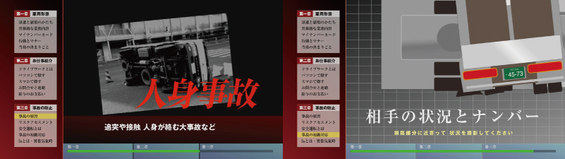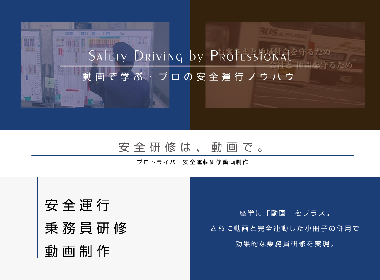 トラック・バス・タクシーなど。運輸系・旅客系企業さまの乗務員研修用動画の制作を承ります。運輸系企業では、安全研修が何より大事。そして研修でもっとも有用なのが、動画教材です。動画なら、実際に撮影した画像でリアルに研修内容を学ぶことができます。また、動画に完全連動した小冊子も作成すれば効果は倍増。映像で見て、小冊子で確認する。理想的な研修のかたちが実現します。また映像なら、一度作れば何度でも活用できるのも見逃せないポイント。このようにメリットの大きな研修用動画と小冊子、御社でも導入してみませんか?