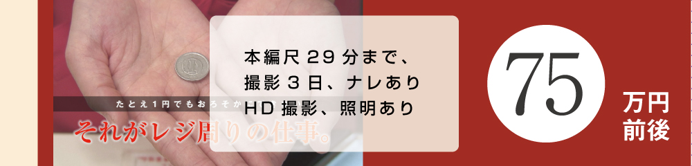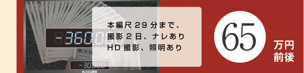 本編尺は最大29分、撮影は3日間(ハイビジョン撮影)、照明あり、ナレーションありの場合のお見積り例です。撮影日が1日多く取られているので、じっくり撮影することができます。なお上記含め諸経費は別途ご請求申し上げる形となります。