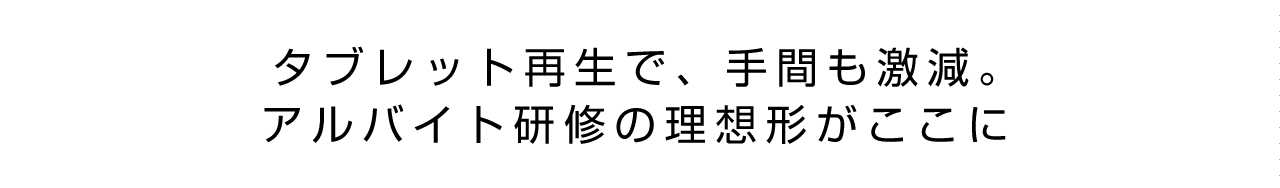 動画で研修を行う最大のメリット・それは、研修担当者ごとによる「伝達内容相違の防止」と「手間の削減」。動画なら、再生するだけで完全に研修内容をまったく同一に統一することが可能です。さらに、新人さんにタブレットを渡してみてもらうだけなので、研修ご担当者さまの手間が大幅に削減。そう、あらゆる点で理想的な研修教材・それが、制作動画と連動ポケットブックなのです。