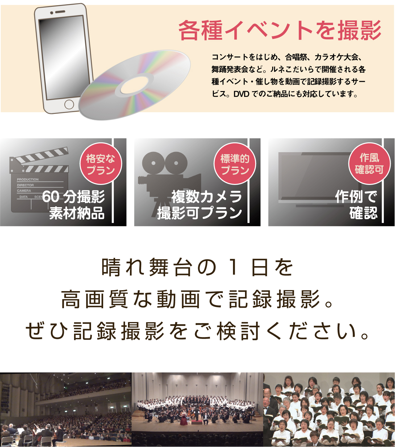 ルネこだいら 記録動画撮影サービス トップ 2020/04/22 これからルネこだいらでイベント開催・参加を控えている皆さん。この度の晴れ舞台を「高画質な動画で」撮影しませんか? 動画で残せば、いつでもこの日をふり返ることができます。スマホ撮影とはまったく異なる、プロ技術による記録動画撮影。ぜひご検討ください。 記録動画撮影のご質問にお答えしています。分かりづらいお見積り、ここでズバリご回答!ホールでの記録動画撮影なら、ぜひご相談くださいませ。まんがでお見せします、くすのき台エージェンシー当社のあゆみと詳細をご紹介しています。弊社の豊富な制作実績を記事でまとめました。資料小冊子をお送りします。まずはメールでお問合せ下さい。