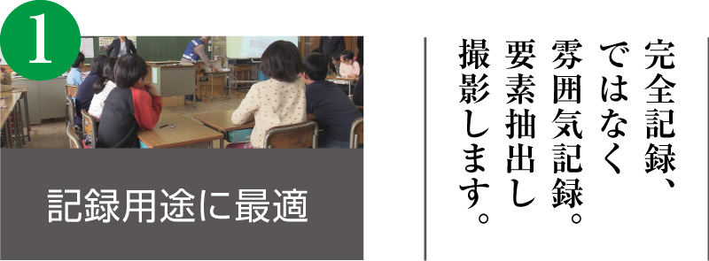 「現場の動画」は、撮影時間が60分。これもあり、いわゆる「行事の完全記録」ではなく「かいつまんで記録」に好適なサービスです。イベントの要所を抽出することで、いつ・どこで・だれが・何を、を分かりやすく記録します。