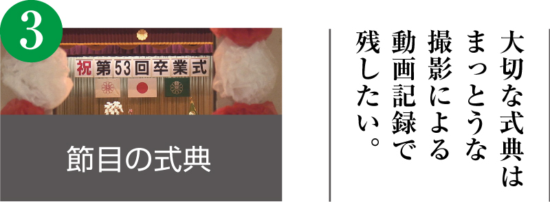 上記の通り、本サービスはいわゆる完全記録ではなく「要素抽出のダイジェスト撮影」。ですが、プロの手法による撮影なので、おおむねイベントの流れをきちんと残せます。大切な式典はまっとうな撮影で残したいものです。