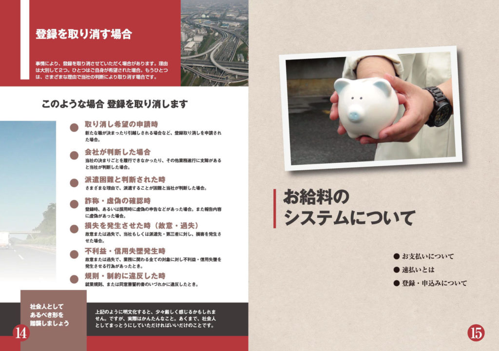 逆に言えば、多種多様な登録候補者が殺到する派遣会社さまのセミナーでは、動画による研修だけだともうひとつ効果に「つきぬけ」感がありません。そこにもし、ポケットブックがあれば。研修内容の振り返りに役立つのはもちろんですが、現場に入った後でも「クレド」的に活用できるという一面があり、ここが大変注目されているのです。その意味では、まさに一石二鳥。