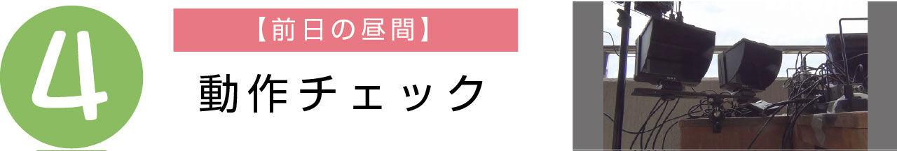 ひと通りの機材設営を終え、あとは機材の動作チェックです。中継では無線も使用するため、電波状況の確認は欠かせません。また、納品用信号伝送ケーブルの確認や実際の絵出しなど、すべき作業がたくさん。丸一日近くの作業となります。