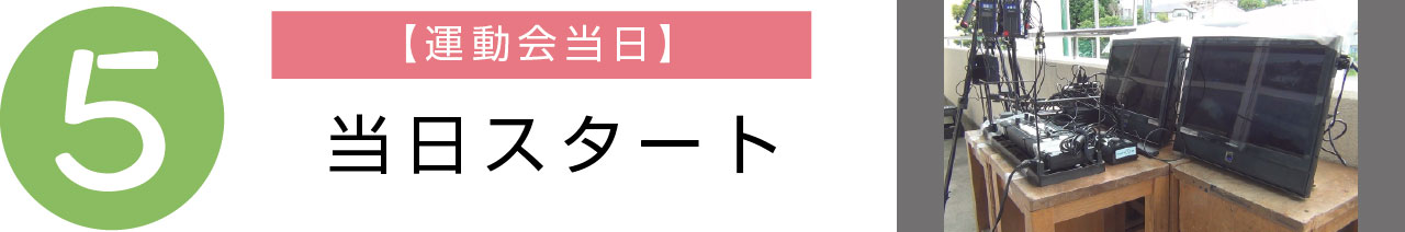 運動会の前日です。当社は機材の設営・調整を必ず前日に行います。運動会は朝一番からの開始がほとんどのためです。ちなみに事前の下見やお打合せ、カメラ位置の吟味などは、3週間以上前から開始しています。