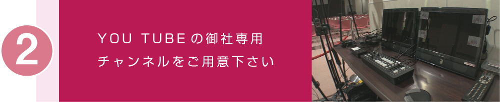 イベント会場に「光回線」、御社にて「YOU TUBEチャンネル・アカウント」をお持ちなら、すぐに動画中継の開始が可能です。当社スタッフが撮影・スイッチング・機材を設営・設定。これを、YOU TUBEの御社チャンネルに接続します。これまで以上にお手軽に、ライブスイッチング中継をご活用いただけます。