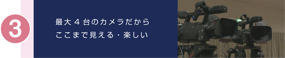 当社ストリーミング中継は、最大4台のカメラを用いて行います。これによりテレビ中継さながらの映像を実現。しかもうち1台は無線伝送できるため、より自由なカメラ配置が可能。中継では、4台のカメラ映像を適宜切り替え、配信します(4台プランの場合)。