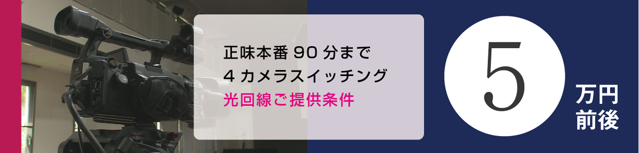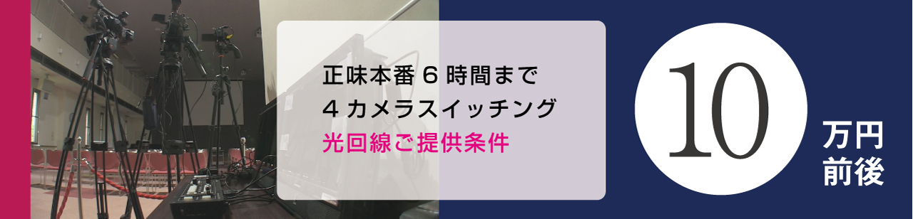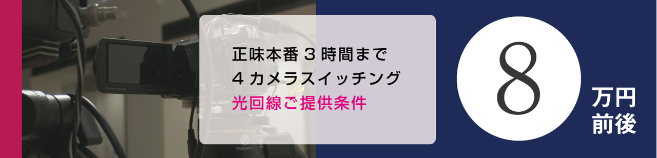 機材設営時間を除く本番収録6時間未満の場合の、4カメラスイッチング中継・大体のご予算です。特に変わった内容でなければ、エクストラは発生しません。