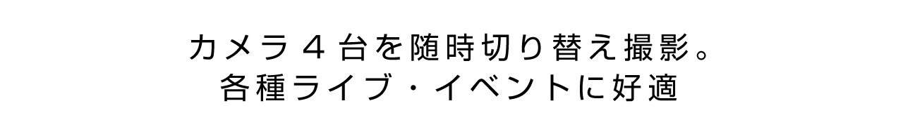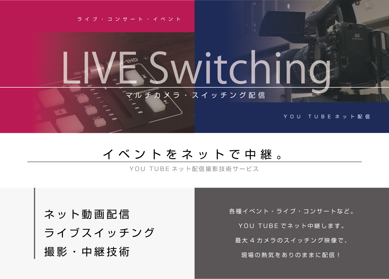ライブハウス・コンサート、各種イベントなど。さまざまな行事を、YOU TUBEライブストリーミング動画中継します。YOU TUBEにチャンネルをお持ちなら、どなたでも大丈夫。カメラ4台をリアルタイムで切替えるスイッチング映像をご提供いたします(4台プランの場合)。最大40倍相当の超望遠クローズアップカットも可能! 一方、よりリーズナブルな「2台プラン」もご用意しました。こちらは小規模イベントに好適。小回りの利くワンマンオペレーションで、御社の行事をマルチに展開できる中継映像で高画質配信いたします。